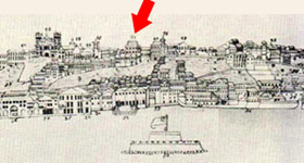 Cidade de Salvador vista pelo mar com a indicação da localização da primeira Casa da Moeda. Desenho de José Caldas