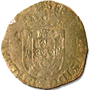 Escudo de Portugal sob coroa orlado pela inscrição SEBASTIANVS I D G PORT ET ALGARBIORVM (D. Sebastião I, por graça de Deus, [o décimo sexto Rei] de Portugal e Algarve)