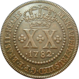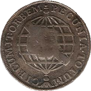 2o. tipo: coroa alta. Com carimbo de escudete. Carimbo unifacial criado pelo Alvará de 18/04/1809 para duplicar seu valor.