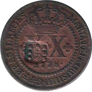 1º. tipo, coroa baixa. Com carimbo de escudete. Carimbo unifacial criado pelo Alvará de 18/04/1809 para duplicar seu valor.