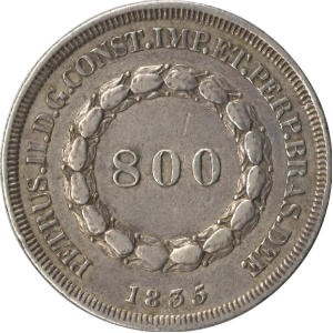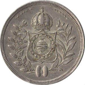 ANVERSOValor facial orlado por coroa de tulipas. Legenda PETRUS. II. D. G. CONST. IMP. ET. PERP. BRAS. DEF e eraREVERSOArmas portuguesas sob legenda IN HOC S VINCES
