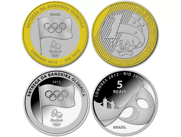 A moeda bimetálica de circulação comumNo anverso, a bandeira olímpica sob o nome BRASIL e sobre a logomarca da Olimpíada do Rio orlada acima pela legendas ENTREGA DA BANDEIRA OLÍMPICA e, abaixo, por LONDRES 2012 RIO 2016. O reverso mantém o mesmo aspecto das atuais moedas de um real, sem qualquer modificação.