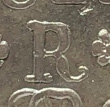 Casa da Moeda do Rio de Janeiro. Letra monetária R. 3 patacas ou 1 patacão. Reino Unido. Variante com a letra monetária R prolongada lembrando um rabo de macaco.