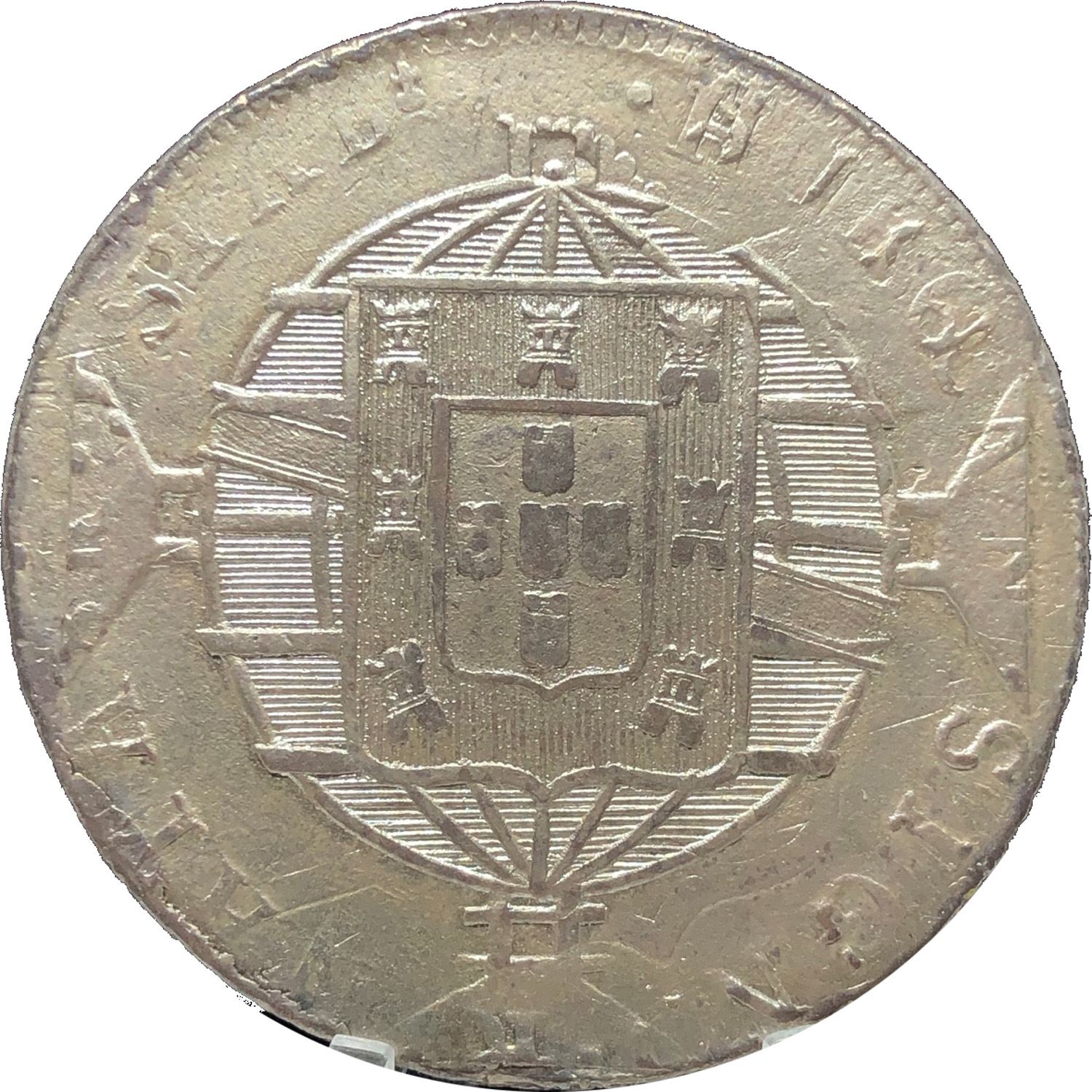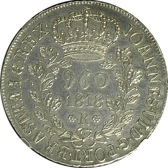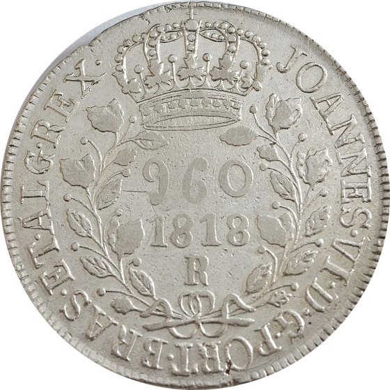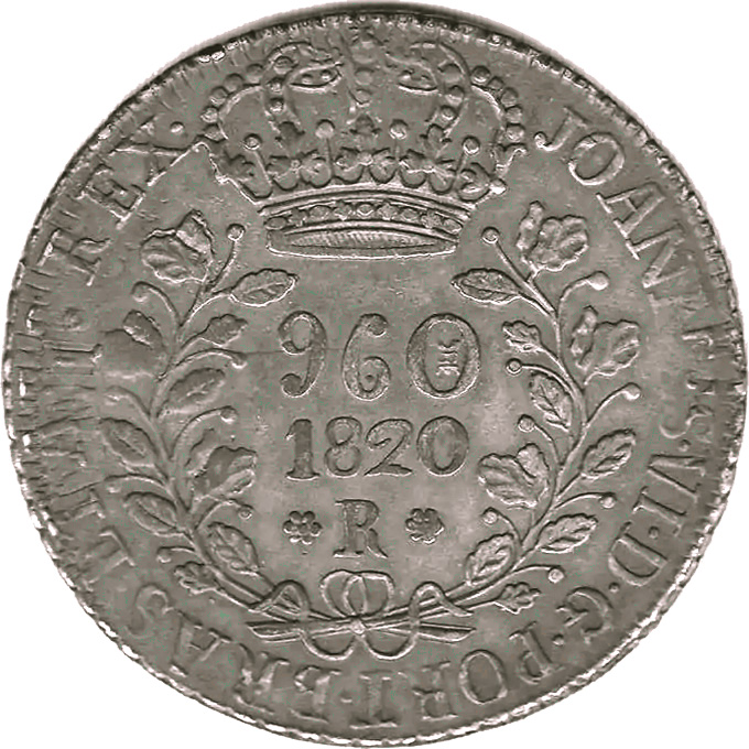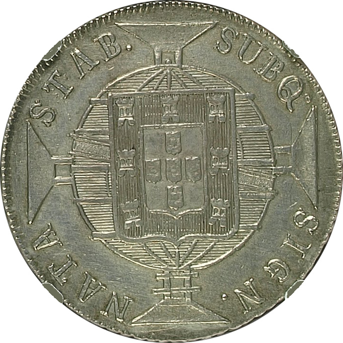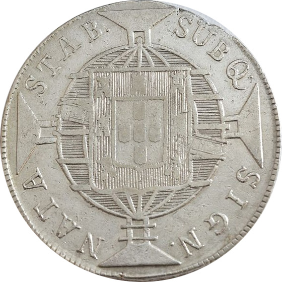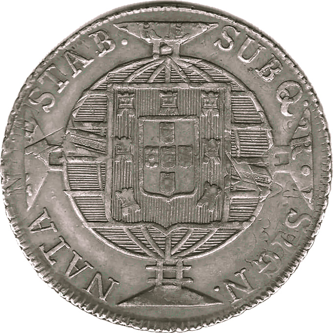 ANVERSOJOANNES. VI. D. G. PORT. BRAS. ET. ALG. REX. Letra monetária R entre cruzetasREVERSOSUBQ. SIGN. NATA. SATB(sic!).