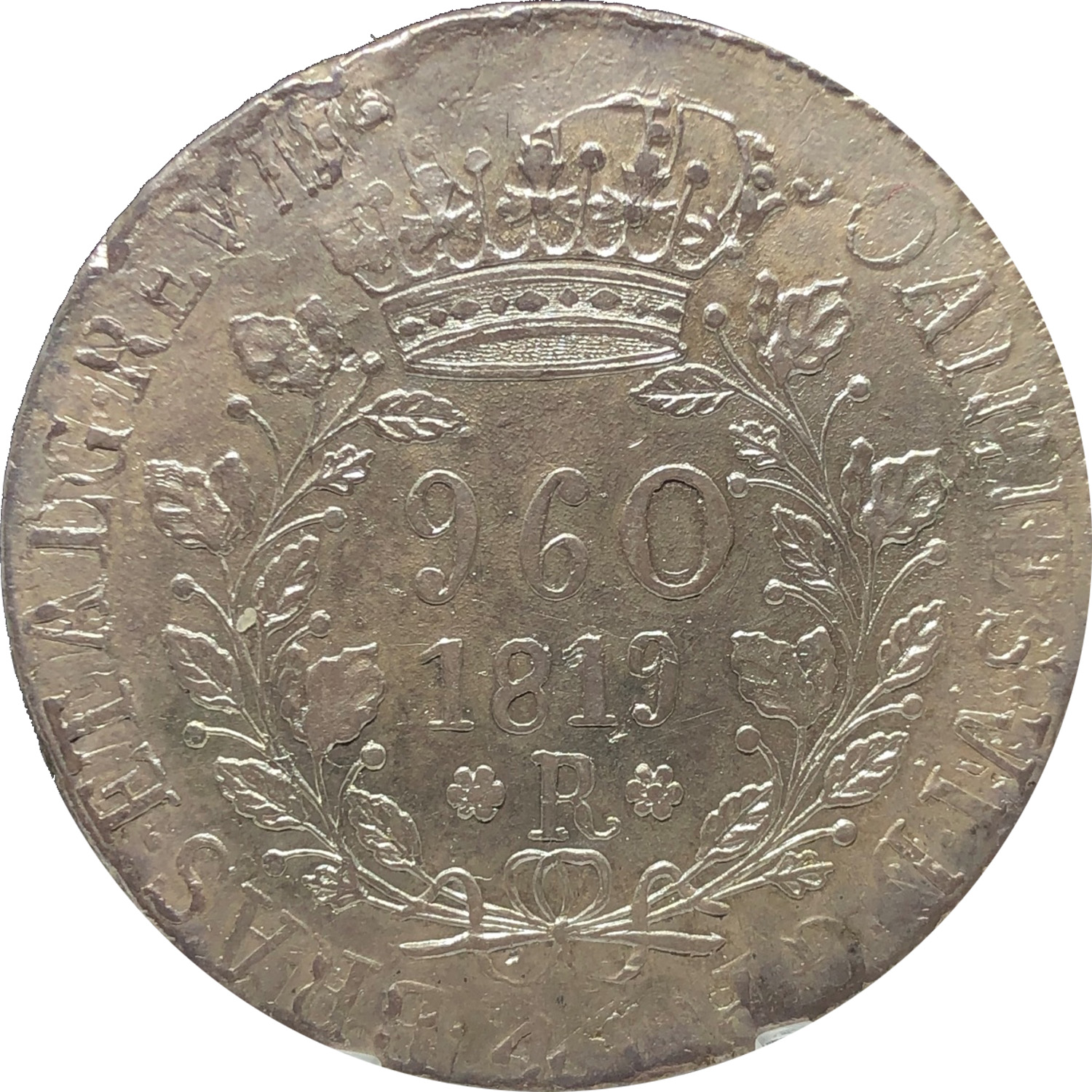Casa da Moeda do Rio de Janeiro. Letra monetária R. 3 patacas ou 1 patacão. Reino Unido. Variante com galhos triplos e legenda com um ponto entre o R e o EX (R.EX). Coleção Gabriel Santos, NGC 2803640-024