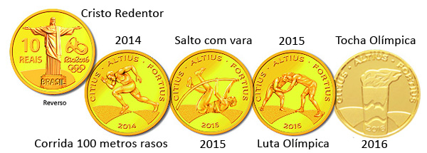 As moedas foram lançadas aos poucos. Cada lote foi composto de quatro moedas bimetálicas, sendo quatro de prata e uma de ouro. As primeiras entraram em circulação em agosto de 2014. Seguida das demais em fevereiro de 2015, agosto de 2015 e fevereiro de 2016. O projeto das moedas foi desenvolvido pelo Banco Central, pela Casa da Moeda e com suporte técnico do Comitê Organizador dos Jogos do Rio 2016. As moedas de ouroO reverso das moedas de ouro é comum a todas: a estátua do Cristo Redentor, com o valor facial de 10 reais à esquerda, as logomarcas dos Jogos Olímpicos Rio 2016 à direita, e o dístico "BRASIL" abaixo. O lema olímpico "Citius, Altius, Fortius" (o mais rápido, o mais alto, o mais forte), gravado nos anversos das moedas de ouro, encoraja os atletas a darem o seu melhor. Para representar este lema, foram escolhidas três modalidades tradicionais das Olimpíadas. Na primeira moeda, a "corrida de 100 metros rasos" ilustra o desejo de ser "o mais rápido". Na segunda, o "salto com vara" simboliza "o mais alto", e na terceira, a "luta olímpica" representa "o mais forte". A quarta e última moeda da coleção apresenta a ilustração da tocha olímpica, um símbolo icônico dos Jogos, que representa a união e o espírito de competição saudável que caracterizam o evento.