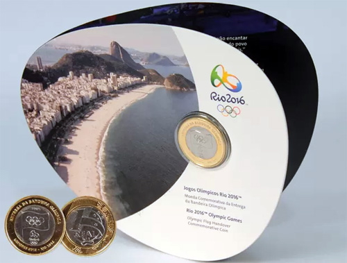 A moeda bimetálica de circulação comumNo anverso, a bandeira olímpica sob o nome BRASIL e sobre a logomarca da Olimpíada do Rio orlada acima pela legendas ENTREGA DA BANDEIRA OLÍMPICA e, abaixo, por LONDRES 2012 RIO 2016. O reverso mantém o mesmo aspecto das atuais moedas de um real, sem qualquer modificação.