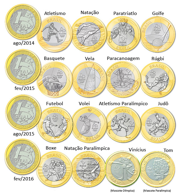 As moedas foram lançadas aos poucos. Cada lote foi composto de quatro moedas bimetálicas, sendo quatro de prata e uma de ouro. As primeiras entraram em circulação em agosto de 2014. Seguida das demais em fevereiro de 2015, agosto de 2015 e fevereiro de 2016. O projeto das moedas foi desenvolvido pelo Banco Central, pela Casa da Moeda e com suporte técnico do Comitê Organizador dos Jogos do Rio 2016. As moedas de ouroO reverso das moedas de ouro é comum a todas: a estátua do Cristo Redentor, com o valor facial de 10 reais à esquerda, as logomarcas dos Jogos Olímpicos Rio 2016 à direita, e o dístico "BRASIL" abaixo. O lema olímpico "Citius, Altius, Fortius" (o mais rápido, o mais alto, o mais forte), gravado nos anversos das moedas de ouro, encoraja os atletas a darem o seu melhor. Para representar este lema, foram escolhidas três modalidades tradicionais das Olimpíadas. Na primeira moeda, a "corrida de 100 metros rasos" ilustra o desejo de ser "o mais rápido". Na segunda, o "salto com vara" simboliza "o mais alto", e na terceira, a "luta olímpica" representa "o mais forte". A quarta e última moeda da coleção apresenta a ilustração da tocha olímpica, um símbolo icônico dos Jogos, que representa a união e o espírito de competição saudável que caracterizam o evento.